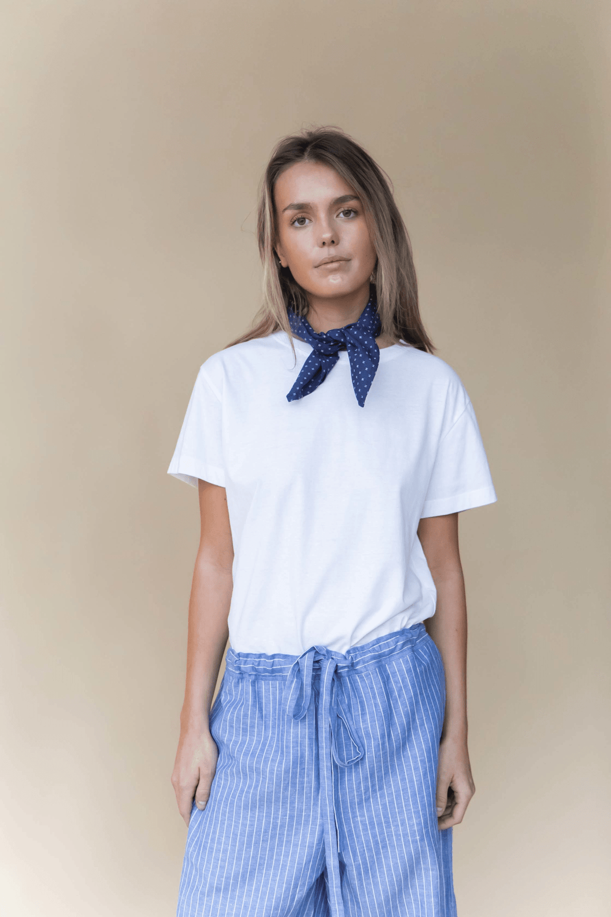 Nice, small, square scarf in a light 100% organic cotton poplin. Looks great as a bandanna around the neck, in the hair or on a bag handle. Tie the Nico scarf in a small knot at the front of the neck, and wear it, for example, on a simple, white t-shirt or top.